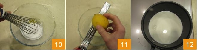 misture os ingredientes com um batedor manual 10, depois aromatize a mistura com as raspas de um limão não tratado 11. Coloque o leite para aquecer em uma panelinha 12