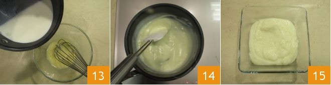 e quando estiver quente, despeje o leite na tigela com a mistura recém-preparada 13, misture tudo e leve o creme de volta ao fogo 14. Continue mexendo o creme com uma espátula até que engrosse bem e transfira-o para uma tigela 15,