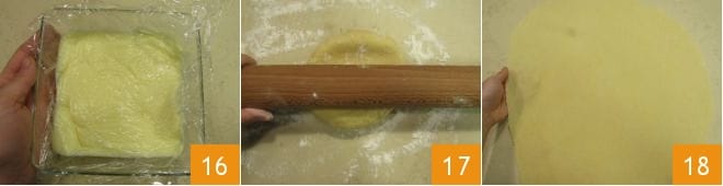 cobrindo-o com filme plástico em contato 16. Antes de usar, o creme deve estar bem frio. Uma vez frio, transfira-o para um saco de confeiteiro com bico frisado e coloque na geladeira até pouco antes de rechear as rosas. Recupere a massa, enfarinhe ligeiramente a superfície de trabalho e comece a estender a massa com um rolo 17. Estenda a massa, obtendo uma folha de 1 milímetro e meio de espessura 18 (recomenda-se respeitar a espessura indicada para obter um bom resultado).