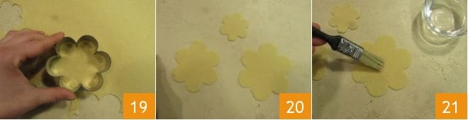 Corte a folha obtida com três cortadores de massa em forma de flor com 10 cm, 8,5 cm e 5 cm de diâmetro, respectivamente 19, obtendo assim 24 flores 20: 8 flores de 10 centímetros, 8 de 8,5 centímetros e 8 de 5 centímetros. Comece a aquecer o óleo de sementes, que deve atingir uma temperatura de 140°C medida com um termômetro de cozinha. Com a ajuda de um pincel e um pouco de água, pincele a parte central da flor maior 21,