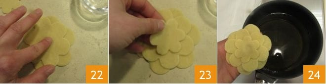 cole em cima a flor de tamanho médio de forma que as pétalas não coincidam, mas sejam alternadas 22, pincele novamente a parte central e cole a flor menor, também neste caso não coincida as pétalas para criar um motivo alternado 23. Obtém-se assim 8 rosas compostas por três flores de diferentes tamanhos. Uma vez atingida a temperatura certa, frite suas rosas uma de cada vez, mergulhando-as no óleo 24