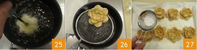 e pressionando o centro com o cabo de uma colher de sopa 25; desta forma, a rosa permanecerá perfeitamente em forma. Bastará cerca de 1 minuto e meio por rosa para que fique dourada no ponto certo, então escorra-a com uma escumadeira 26 e coloque sobre uma bandeja forrada com papel absorvente. Deixe suas rosas amornarem, depois polvilhe-as com um pouco de açúcar de confeiteiro 27,