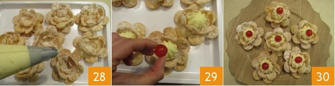 recheie o centro com o creme de confeiteiro 28 e coloque uma cereja cristalizada em cada rosa 29. Sirva imediatamente suas rosas de Carnaval!