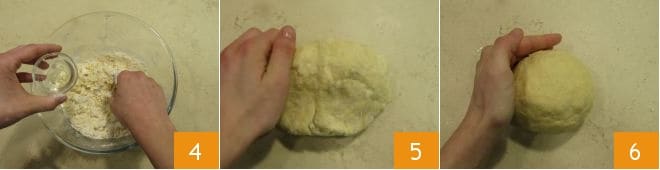 Adicione também o vinho branco 4, continue a amassar, transfira a massa para a bancada 5 e trabalhe-a até obter uma massa lisa e bem homogênea 6.