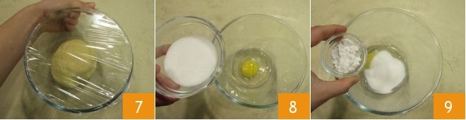Coloque a massa em uma tigela, cubra com filme plástico 7 e deixe descansar por cerca de 30 minutos em temperatura ambiente. Enquanto isso, prepare o creme de confeiteiro: em uma tigela, coloque o ovo, o açúcar 8 e o amido de milho 9,