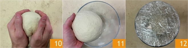 Trabalhe a massa sobre a bancada até formar um bloco liso 10, depois coloque-o na tigela 11 e cubra com várias camadas de filme plástico 12. Deixe fermentar na geladeira durante a noite.