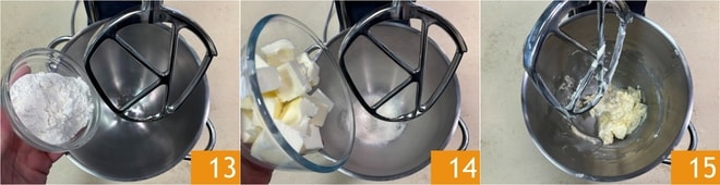 Agora prepare a manteiga para folhear: na batedeira equipada com pá, coloque a farinha 13 e a manteiga amolecida 14. Misture até obter uma mistura homogênea, tomando cuidado para não trabalhar demais 15.