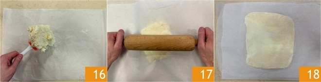 Transfira a mistura para um pedaço de papel manteiga 16, cubra com outro pedaço de papel manteiga e estenda com o rolo 17 até formar um quadrado de cerca de 20x20 cm, com espessura de cerca de 1 cm 18. Coloque também na geladeira para descansar.