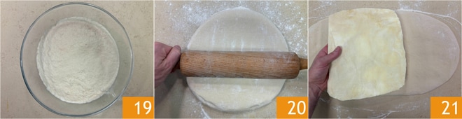 Na manhã seguinte, retire a massa fermentada 19 e estenda sobre uma superfície levemente enfarinhada até obter uma forma retangular com o dobro do comprimento do lado do quadrado de manteiga 20. Coloque o quadrado de manteiga no centro do retângulo 21.
