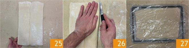 Neste ponto, prossiga com uma dobra em 3, dobrando as bordas laterais para o centro e fazendo-as coincidir 25. Com uma faca afiada, faça incisões ao longo dos lados do retângulo obtido 26. Transfira a massa folhada para uma bandeja, cubra com filme plástico 27 e coloque para resfriar na geladeira por 30 minutos.