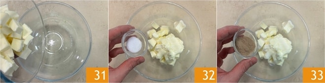 Dedique-se ao recheio: coloque a manteiga em ponto de pomada em uma tigela 31, depois adicione o sal 32 e o cardamomo em pó 33.