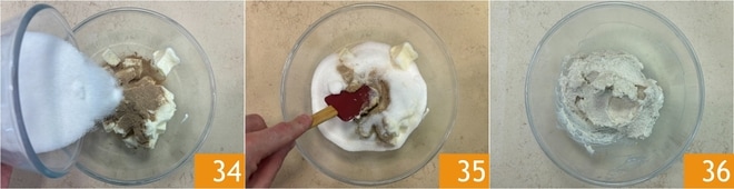 Adicione também o açúcar 34 e misture tudo com uma espátula de silicone 35 até obter uma mistura homogênea 36. Mantenha à temperatura ambiente.
