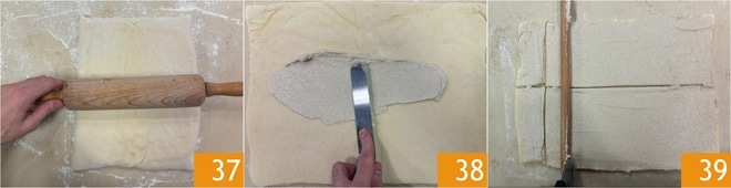Após o tempo de resfriamento, retire a massa e estenda com o rolo 37 até formar um retângulo de cerca de 30x40 cm, com espessura de 5 mm. Cubra a superfície com o creme de manteiga e cardamomo, espalhando com uma espátula 38. Neste ponto, divida o retângulo ao meio no sentido do comprimento e corte-o em tiras com largura de cerca de 15x5 cm 39; você deve obter 16 tiras de massa folhada.