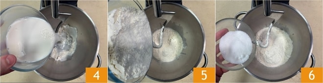 Despeje a mistura na tigela de uma batedeira equipada com gancho 4, depois adicione a farinha 5 e o açúcar 6.