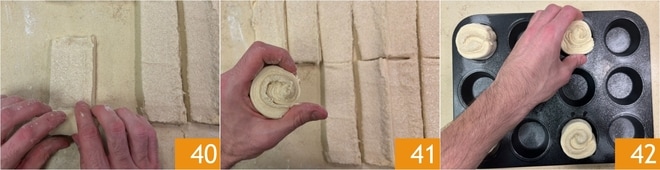 Enrole cada tira 40 de forma a formar rolinhos 41. Posicione os rolinhos em uma forma de muffin bem untada, tendo o cuidado de espaçá-los uns dos outros 42. Deixe fermentar no forno desligado com a luz acesa por cerca de 3 horas, borrifando-os de vez em quando com um pouco de água para evitar que a superfície seque.