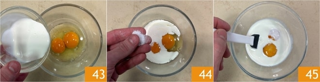 Enquanto isso, coloque o ovo, a gema e o creme de leite em uma tigela pequena 43, adicione o sal 44 e misture 45.