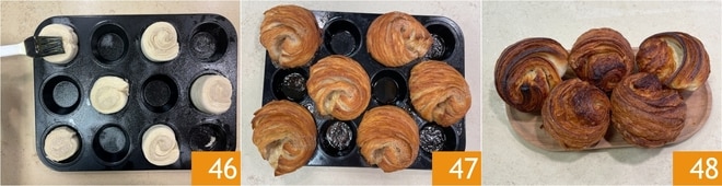 Após o tempo de fermentação, pincele os rolinhos com a mistura de creme de leite 46 e asse em forno ventilado pré-aquecido a 180° por cerca de 6 minutos, depois coloque uma bolinha de papel alumínio na porta para mantê-la ligeiramente aberta e continue assando por mais cerca de 12 minutos. Quando estiverem douradas, retire do forno 47 e sirva suas lindas rosas de massa folhada 48!