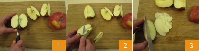 Para preparar as rosinhas de massa folhada e maçãs, comece colocando no fogo uma panela cheia de água, depois passe a limpar as maçãs: corte-as em pedaços 1, retire o miolo com uma faca 2 ou com o utensílio apropriado. Depois corte as maçãs em fatias bem finas 3.
