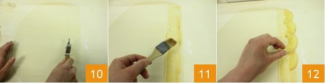 Usando um cortador de massa liso, obtenha de cada folha 6 tiras de massa com cerca de 5 cm de largura 10. Pincele cada tira com a geleia de damasco 11, seque as fatias de maçã com um papel absorvente e coloque-as ao longo de cada tira, ligeiramente sobrepostas: a parte com a casca deve sobressair de um dos lados da tira de massa folhada 12.