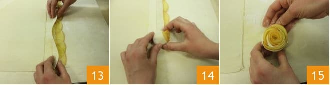 Agora, dobre a tira restante de massa folhada sobre as maçãs 13 e enrole sobre si mesma começando de uma das duas extremidades mais estreitas 14; fixe bem a última parte e assim você terá formado uma rosinha 15.