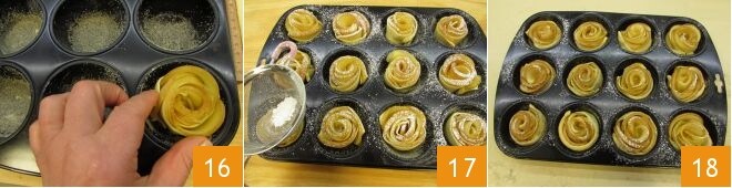 Coloque cada rosinha dentro de um dos buracos da forma 16 e quando terminar, polvilhe com açúcar de confeiteiro 17. Asse em forno estático pré-aquecido a 170°C por 45 minutos. Uma vez assadas, retire as rosinhas de massa folhada e maçãs do forno 18 e antes que esfriem, desenforme, caso contrário, ao esfriar, o açúcar tenderá a solidificar e poderá ser difícil soltá-las.