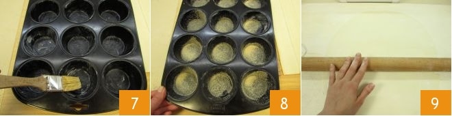 Agora, ocupe-se de untar uma forma de muffin usando um pincel e manteiga amolecida 7, depois forre cada seção com o açúcar mascavo 8. Pegue a massa folhada e estenda de forma a obter dois retângulos 9.