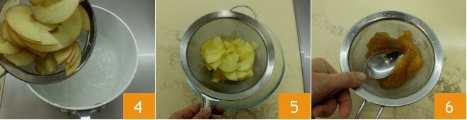 Quando a água atingir a fervura, coloque as maçãs e deixe ferver por 1 minuto, até que fiquem macias sem desmanchar. Depois desligue o fogo, escorra-as 5 e deixe esfriar. Neste ponto, você pode passar a geleia de damasco pela peneira para torná-la mais cremosa (é um passo opcional) 6.