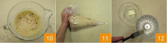 Depois de incorporar as frutas vermelhas à massa 10, transfira-a para um saco de confeitar 11 e prepare-se para untar 12 e enfarinhar 5 forminhas em forma de rosquinha com diâmetro de 12 cm e 4 cm de altura.