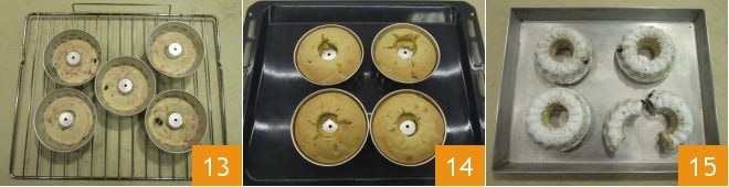 Preencha as forminhas com a massa até a metade da altura delas 13, depois asse em forno estático pré-aquecido a 180° por cerca de 25 minutos, posicionando-as na prateleira do meio. Uma vez assadas, retire as rosquinhas do forno 14 e deixe-as esfriar, em seguida, retire das formas. Sirva suas deliciosas rosquinhas de coco e frutas vermelhas polvilhadas com bastante açúcar de confeiteiro 15!