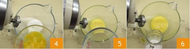 Agora coloque o açúcar na tigela de uma batedeira equipada com gancho tipo folha, adicione os ovos 4 e trabalhe em baixa velocidade até obter um composto claro e espumoso. Depois desligue a batedeira, adicione o óleo de coco 5, trabalhe novamente e, após alguns minutos, adicione também o leite de coco 6.