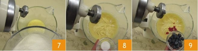 Quando o composto se tornar homogêneo, desligue novamente a máquina, adicione a farinha previamente peneirada com o fermento 7 e continue trabalhando até que os ingredientes secos estejam bem incorporados. Por fim, adicione o sal 8, as framboesas e os mirtilos 9 e misture novamente.