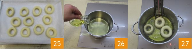Deixe as rosquinhas crescerem cobertas com filme plástico em temperatura ambiente, longe de correntes de ar ou sempre no forno desligado com a luz acesa por pelo menos 1 hora. Assim que as rosquinhas dobrarem de volume 25, despeje o óleo para fritar em uma panela 26 e aqueça até atingir uma temperatura de 170º (use um termômetro de cozinha para medir a temperatura exata). Em seguida, mergulhe 3-4 rosquinhas de cada vez no óleo quente 27.