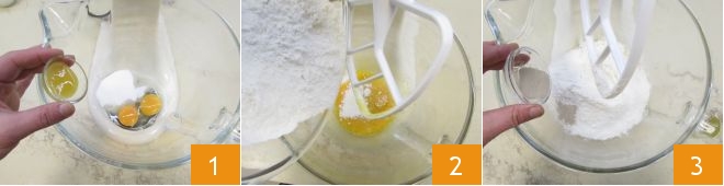 Para preparar as rosquinhas fritas recheadas com creme de chocolate, comece fazendo a massa. Na tigela de uma batedeira com batedor, coloque os ovos, o açúcar e o mel 1. Em seguida, adicione a farinha peneirada 2 e o fermento biológico seco 3.
