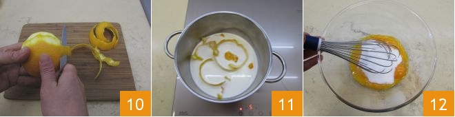 Enquanto isso, prepare o creme de chocolate que servirá para rechear suas rosquinhas. Descasque a laranja 10 e transfira a casca para uma panela. Adicione leite e creme de leite 11 e leve quase ao ponto de fervura. Em seguida, desligue o fogo e deixe em infusão por cerca de 1 hora. Após esse tempo, pique finamente o chocolate e reserve. Quebre os ovos e separe as claras das gemas, acrescente o açúcar às gemas e bata energicamente com um batedor 12.