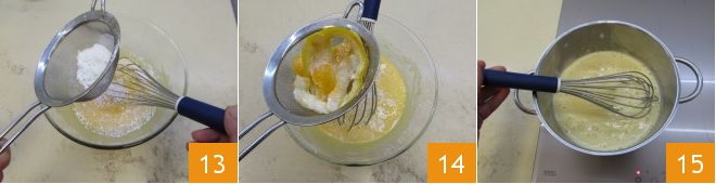 Depois de obter uma mistura clara e espumosa, adicione a farinha e o amido de milho previamente peneirados 13 e misture rapidamente. Neste ponto, coe a mistura de leite e creme, mantendo a casca das laranjas e adicione o líquido ao restante dos ingredientes 14. Despeje tudo em uma panela e leve ao fogo 15, continue mexendo até obter um composto liso e suficientemente denso.