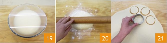 Após o tempo necessário, a massa terá dobrado de volume 19. Pegue-a novamente e coloque sobre uma superfície levemente enfarinhada. Estenda com um rolo 20 até obter uma espessura de 1 cm e, com um cortador de 7,5 cm de diâmetro, corte discos 21.
