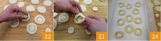 Retire delicadamente a massa entre os discos e, com um cortador de 3,5 cm de diâmetro, corte novamente para criar o clássico furo 22; em seguida, alargue-o levemente com as mãos 23 e coloque cada rosquinha em uma assadeira forrada com papel manteiga, distanciando-as umas das outras 24. Para reutilizar a massa restante, basta trabalhá-la com as mãos por alguns minutos, deixe-a descansar cerca de 30 minutos e depois estenda novamente para fazer mais rosquinhas.
