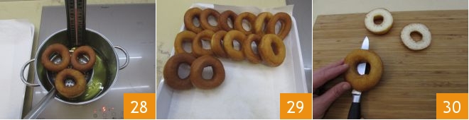 Frite suas rosquinhas por cerca de 2-3 minutos, virando-as apenas uma vez. Retire-as do óleo usando uma escumadeira 28 e coloque-as em uma bandeja forrada com papel absorvente 29 para eliminar o excesso de óleo. Depois de fritar todas as rosquinhas, com uma faca de lâmina afiada, abra-as ao meio 30.