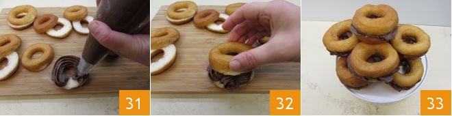 Transfira o creme de confeiteiro para um saco de confeitar e use-o para rechear suas rosquinhas (31-32). As rosquinhas fritas recheadas com creme de chocolate estão prontas 33, agora é só servi-las!