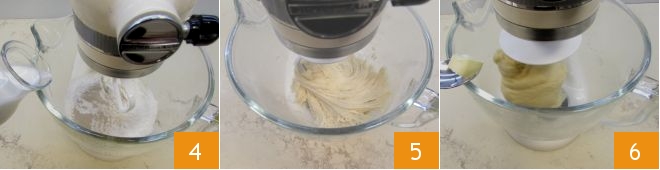 Ligue a máquina, adicione também o leite em temperatura ambiente aos poucos 4 e, por último, uma pitada de sal. Continue trabalhando os ingredientes até que a massa fique homogênea. Substitua o batedor pelo gancho e sove novamente 5; quando a massa estiver enrolada no gancho, adicione um pedaço de manteiga amolecida 6 de cada vez, esperando que seja absorvida antes de adicionar mais!