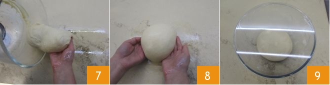 Depois que a manteiga for completamente absorvida, vire a massa sobre uma superfície de trabalho levemente untada com óleo 7 e trabalhe-a por alguns instantes: deverá estar bastante macia. Dê uma forma esférica à massa 8 e coloque-a em uma tigela levemente untada, cubra com filme plástico 9 e deixe crescer por 2 horas no forno desligado com a luz acesa.