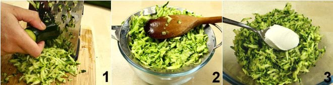 Para preparar o rolo de panquecas com abobrinhas, comece lavando, cortando as extremidades e ralando as abobrinhas com um ralador de furos grandes 1; em seguida, esprema bem auxiliando-se com uma peneira 2 e coloque-as em uma tigela. Em seguida, adicione o queijo Philadelphia 3 e o molho bechamel que você terá preparado com as quantidades indicadas acima e seguindo o procedimento que você encontra Bechamel