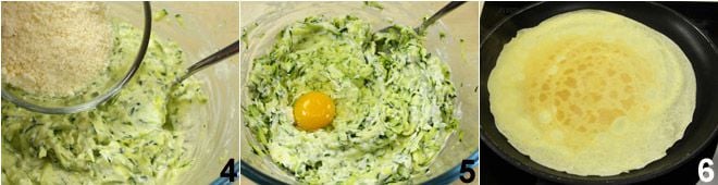 Adicione também o emmental e metade do Grana Padano 4 e, por último, o ovo 5; em seguida, misture e ajuste o sal e a pimenta. Prepare 6 panquecas utilizando os ingredientes indicados acima e seguindo o procedimento que você encontra Crepes doces e salgadas (receita básica) 6.