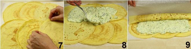 Em uma folha de papel manteiga untada, disponha as panquecas sobrepondo-as um pouco para formar um retângulo 7, espalhe o composto de abobrinhas e Philadelphia no centro do retângulo 8 e enrole as panquecas auxiliando-se com o papel manteiga 9