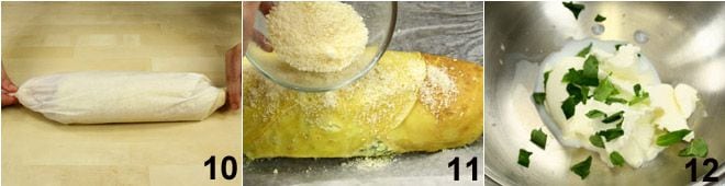Feche o rolo como uma bala, torcendo as extremidades do papel 10 e asse no forno a 180° por cerca de 30 minutos. Em seguida, abra o papel, polvilhe o rolo com o restante do Grana Padano 11 e alguns pedacinhos de manteiga e gratine por mais 5 minutos no grill. Enquanto isso, prepare o creme de manjericão da seguinte forma: coloque em uma panela em banho-maria 2 colheres de Philadelphia com algumas folhas de manjericão 12, duas colheres de leite, Grana Padano e uma pitada de pimenta moída na hora, retire do fogo assim que o molho estiver quente. Sirva o rolo de panquecas com abobrinhas em fatias, regando-as com o creme de manjericão!