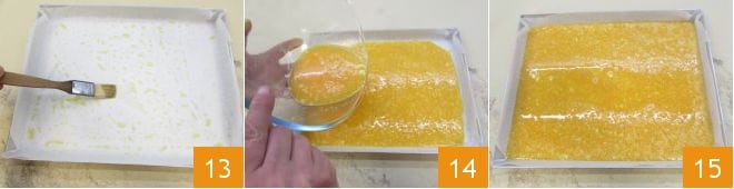 Pegue uma assadeira de cerca de 34x27 cm, forre com papel manteiga e pincele com um pouco de óleo 13. Despeje a mistura 14 e coloque a omelete para assar em forno estático pré-aquecido a 180°C por 15 minutos ou a 160°C por 5-8 minutos em forno ventilado 15.
