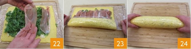e, por fim, termine com uma camada de presunto cru 22. Enrole a omelete 23 e envolva bem apertado com filme plástico 24, tentando apertar o suficiente para manter a forma e torná-lo compacto.