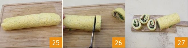 Coloque então o rolo de omelete recheado na geladeira para que se compacte e ganhe sabor por pelo menos 1 hora. Após o tempo necessário, retire delicadamente o filme plástico do rolo 25, corte em fatias 26 e seu rolo de omelete recheado estará pronto para ser servido 27!