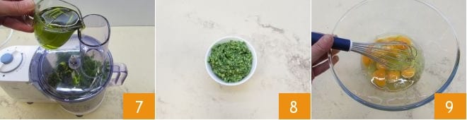 Comece a bater tudo em baixa velocidade 7 e, aos poucos, adicione o restante do azeite de oliva extravirgem em fio até obter um creme bem homogêneo e fluido 8. Uma vez preparado o pesto de rúcula, reserve e comece a preparar a omelete: bata os ovos em uma tigela 9