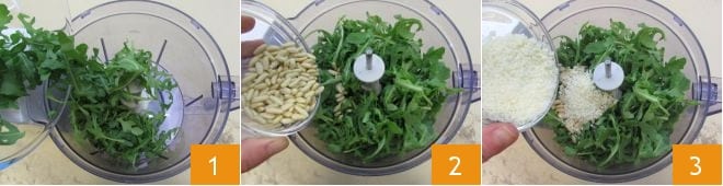 Para preparar o rolo de omelete recheado, comece com a preparação do Pesto de rúcula, que servirá para o recheio. Lave bem a rúcula em água corrente abundante, seque e coloque no copo do mixer 1: adicione os pinhões 2, o Grana Padano ralado 3